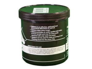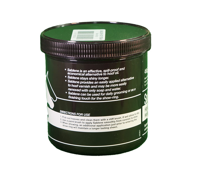 Flexalan Sablene High Sheen Hoof Cream Available in black and clear forms. Totally spill proof and therefore very economical. It contains cod liver oil and gives hooves a beautiful sheen. One easy brush-on application before each event ensures that hooves have that ‘just polished’ look. Size 450g