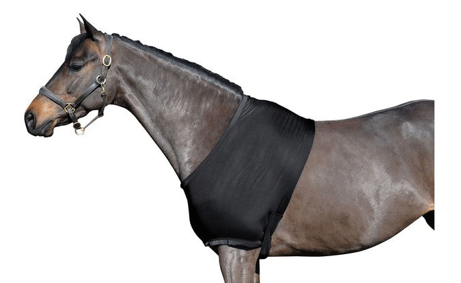 This close-fitting Lycra Mix Garment will protect the withers, shoulders and chest area from rug rubs. It can be worn under outdoor or indoor rugs and has a strap through the front legs and underbelly strap to hold it securely in place.
